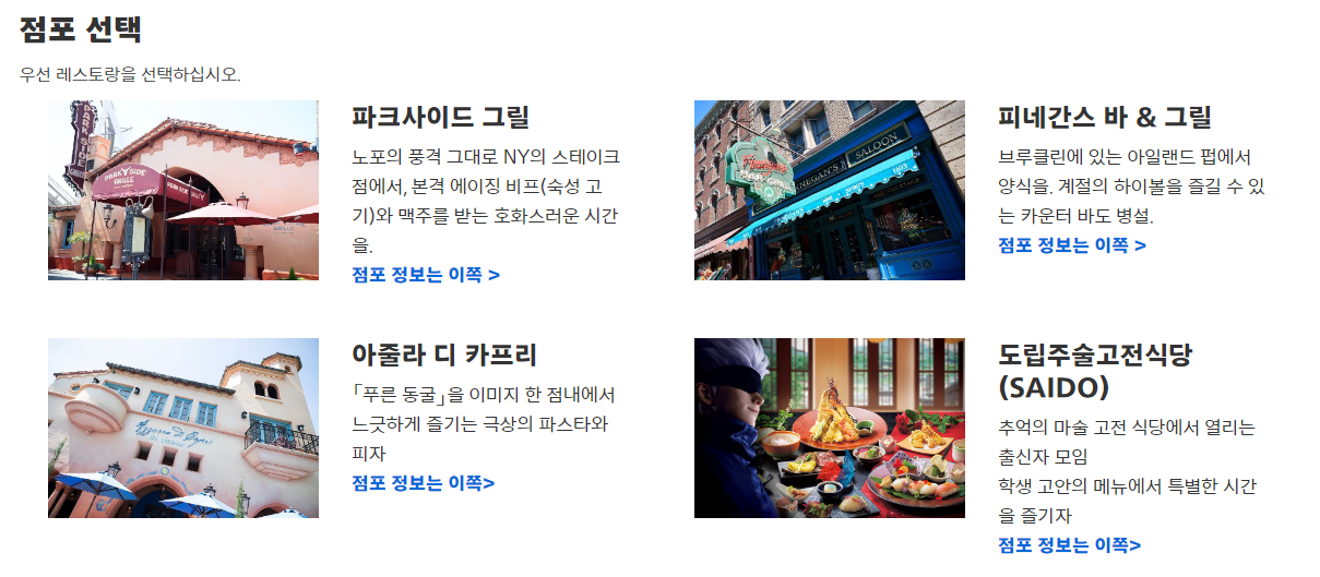 유니버셜 스튜디오 내의 모든 식당이 예약이 되는 것은 아니고, 아래의 식당만 예약 가능합니다.